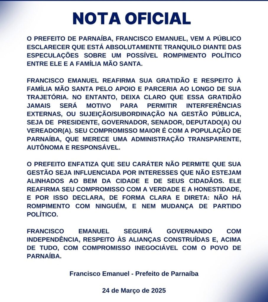 Em Parnaiba o prefeito eleito Francisco Emanuel, o “Novo Francisco” rompeu a aliança política com a família Mão Santa, que o indicou como candidato para suceder o ex-prefeito.